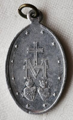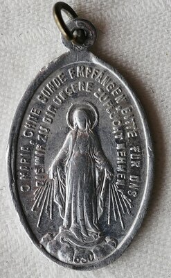 Hintergrund: Die Wundertätige Medaille, auch Wunderbare Medaille genannt, ist eine ovale Gedenkprägung, die im 19. Jahrhundert in Bezug zu einer von der Vinzentinerin Sr. Catherine Labouré berichteten Marienerscheinung angefertigt und in der Folge in großer Zahl verbreitet wurde. Eine erste Erscheinung der Gottesmutter Maria hat Schwester Catherine in der Nacht vom 18. auf den 19. Juli 1830 erlebt. Während zweier Erscheinungen am 27. November und im Dezember 1830 hat Catherine Labouré während der abendlichen Meditationen die Muttergottes gesehen. Diese stand in einem oval geformten Rahmen und auf der Erdkugel. Während Sr. Catherine noch hinsah, bildeten sich aus dem ovalen Rahmen zwölf Sterne, ein großes M, das von einem Kreuz bekrönt wurde, und die stilisierten Herzen Jesu und Mariens.Die Gottesmutter hat Sr. Catherine aufgetragen, eine Medaille mit diesen Motiven der Erscheinung anfertigen zu lassen. Vorderseite der Medaille: Sie zeigt eine Darstellung der Erscheinung der Catherine Labouré November/Dezember 1830: In der Mitte der Plakette steht Maria mit einem Heiligenschein und mit ausgebreiteten Armen auf dem Erdball. Unter ihren Füßen ist eine Schlange. Aus ihren Händen entweichen Strahlen nach unten. Am Rand der Medaille findet sich die Aufschrift: "O MARIA OHNE SÜNDE EMPFANGEN BITTE F. U. DIE WIR ZU DIR UNS. ZUFLUCHT NEHMEN" Unter der Maria befindet sich die Jahreszahl 1830. Diese Jahreszahl bezieht sich nicht auf die Pägung der Medaille, sondern auf das Jahr der Marienerscheinung, Rückseite der Medaille: Auch die Rückseite der Medaille bezieht sich auf diese Erscheinungen: . Das M steht für Maria und in dieser Kombination wird es Marienkreuz genannt. Darunter ist das Brennende Herz Jesu mit der Dornenkrone und das Brennendes Herz Marias mit Rosen und von einem Schwert durchstoßen zu sehen. Maria und die Herzen sind von insgesamt 12 Sternen eingerahmt. Diese Motive sind häufig auch in einen Rosenkranz integriert. Ganz unten findet sdich die Umschrift "GERMANY". Die Medaille ist etwas abgegriffen.