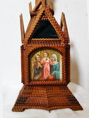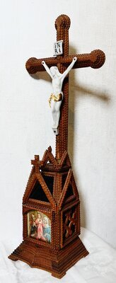Standkruzifix aus dünnen zusammengeleimten Holzbrettchens mit Kerbschnitzereien. Titulus (INRI-Tafel) in Form einer römischen Feldstandarte und der Korpus sind aus Bisquit-Porzellan. Die beiden Füße stehen nebeneinander auf der Konsole. Die Arme sind schräg nach oben ausgestreckt. Der fast die Hälfte der Gesamthöhe einnehmende Sockel zeigt an der Vorderseite ein post-byzantinisches auf Papier gedrucktes Bild der Heiligen Familie. Das Jesuskind zeigt hierbei ein flammendes Herz.