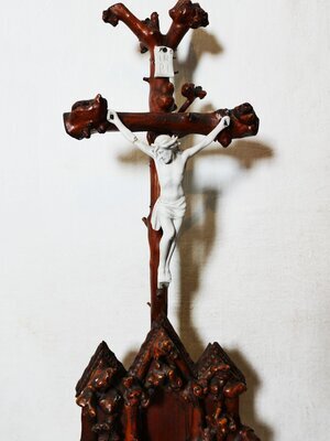 Standkreuz aus Ästen und Wurzelholz. Das eigentliche Kreuz ist herausnehmbar und aus 2 Ästen hergestellt. Die Äste besitzen an ihren Enden Knorpel. Der "Längsbalkenast" verzweigt sich oberhalb des Titulus. Titulus (die INRI-Tafel) in Form einer römischen Feldstandarte und der Korpus sind aus Bisquit-Porzellan. Die beiden Füße stehen nebeneinander auf der Konsole. Die Arme sind schräg nach oben ausgestreckt. Der fast die Hälfte der Gesamthöhe einnehmende Sockel ist vertikal zweigeteilt. Unten ist ein Hocker mit schiefen Beinen und zwischen diesen befindet sich ein von Ornamenten umgebenes flammendes Herz. Darüber deuten drei Giebel möglicherweise eine Kirche an. Die Rückseite des Sockels ist verbrettert.