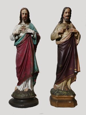 Zwei Herz Jesu Statuen mit identischer Körper- und Kopfform. Der Kopf von HR 1283a (links) ist etwas gerader angesetzt als der von HR 1283b (rechts). Beide greifen mit beiden Händen zu ihrem roten Herz, das Strahlen aussendet, oben golden brennt und darüber ein Kreuz zeigt. HR 1283a ist blau (mittlerweile eher grün), rot, weiß gekleidet dagegen trägt HR 1283b eine Gewandung in ocker und purpurrot mit ockerfarbigen Sternen. HR 1283a steht auf einer runden, HR 1283b auf einer etwas höheren achteckigen Plinte. HR 1283b ist auf der Rückseite beschädigt. Die Verehrung des Herzen Jesus geht bis auf das frühe Mittelalter zurück ist eine Ausdrucksform der römisch-katholischen Spiritualität. Dabei wird das durchbohrte Herz des Gekreuzigten als Quelle der Sakramente der Kirche verehrt. Die neuzeitliche Verehrung des Herzen Jesu gründet sich auf den vier Visionen der französischen Ordensfrau Margareta Maria Alacoque zwischen dem 27. Dezember 1673 und 1675 zurück. Einen Höhepunkt fand die Verehrung in der zweiten Hälfte des 19. und am Anfang des 20. Jahrhunderts.