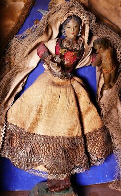 Das Objekt zeigt Maria mit dem Jesuskind in einem Holzkasten. Die Figuren sind aus Wachs. Maria ist größtenteils mit grobem Leinen bekleidet und steht auf einer Plinte mit der Aufschrift Hl. Maria. Klosterarbeit des ehemaligen Klosters St. Clara in Trier. Das Kastenbild kam aus dem Bestand des 1920 gegründeten Klosters der Klarissen-Kapuzinerinnen St. Clara auf dem Petrisberg in Trier im Zuge der Auflösung des Klosters am 31. Januar 2017 in das Freilichtmuseum Roscheider Hof.