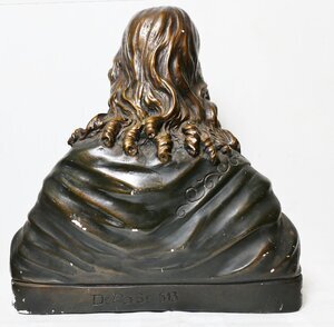 Herz-Jesu Büste. Bronzierte Gipsfigur die den Eindruck eines Brozegusses erwecken möchte. Christus trägt lange Haare und Bart. Mit seiner rechten Hand segnet er der linken Hand zeigt er zu seinem auf der Tunika liegendem Herz samt Dornenkrone. Von dem Herz gehen in alle Richtungen goldene Strahlen aus. Oberhalb des Herzens befinden sich zwei kleine Flämmchen und ein kleines Kreuz. Auf der Plinte befindet die Inschrift S. COEUR. Eine sehr sehr ähnliche Figur wurde (August 2025) bei 1stdibs.com als Bronzeguss angeboten.