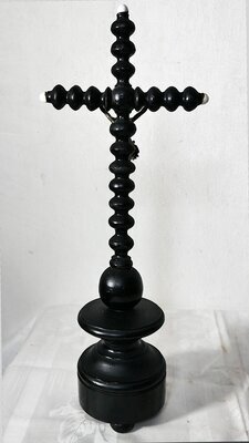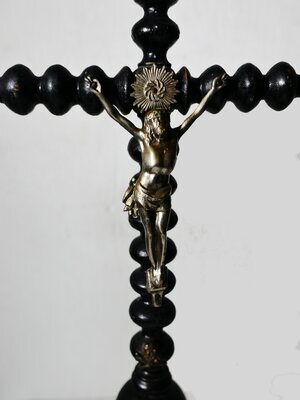 Gedrechseltes schwarzes Standkreuz (Kruzifix) . Das Kreuz besteht aus braunem, schwarz lackiertem Holz. Sowohl der Quer- als auch der Längsbalken mit wuchtigem Fuß sind aus einem Stück gedrechselt. An beiden Enden des Querbalkens und am oberen Ende des Längsbalkens befindet sich eine weiß lackierte Spitze. Die Arme des Korpus sind schräg nach oben ausgestreckt. Der Korpus ist mit 2 Nägeln durch die nach oben gestreckten Hände am Querbalken befestigt. Die Füße stehen auf dem Suppedaneum (einer Konsole), die wiederum am Stamm des Kreuzes befestigt ist. Oberhalb des Kopfes befindet sich als Titulus eine geschwungene INRI-Tafel. Über dem Kopf Christi befindet sich ein strahlenförmiger Nimbus (Heiligenschein). Der Titulus crucis (die INRI-Tafel) ist abgängig. Das Element über der oberste Kugel des Fußes ziert ein Adamsschädel (Totenkopf). Die gedrechselten und schwarz lackierten Holzkreuze fanden wohl vor allem bei der häuslichen Totenaufbahrung Verwendung. Wir bedanken uns ganz herzliche beim Museums am Dom in Trier für die Informationen zur Herstellung und Verwendung dieser Kreuze.