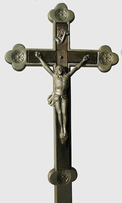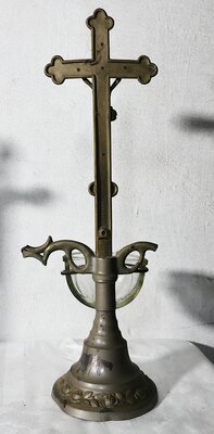Kreuz mit Weihwasserbecken, Drachen (?) und Passen mit vierblättrigen Blüten im Stil des Historismus. Titulus crucis in Form einer Schriftenrolle. Der Nimbus (Heiligenschein) ist abgängig. Korpus vom 4-Nagel Typ. Die Arme zeigen schräg nach oben. Die Füße stehen parallel auf dem Suppedaneum (einer Konsole). In Längs- und Querbalken sind schwarz lackierte Holzleisten eingelegt. Direkt über der Weihwasserschale ragt je eine drachenartige Gestalt nach links und rechts. Die Weihwasserschale selbst ist aus Glas und mit spitzen Blättern verziert. Der Sockel mit 4 Rippen ist rund und mit einem Band aus Blättern und Blüten verziert. Der linke Drache (?) ist teilweise abgebrochen, s. 3. Bild. Das erste Bild ist digital restauriert.
