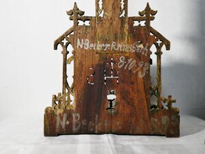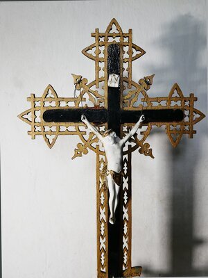 Großes Holzkruzifix als Laubsägearbeit. Das "Innenleben" des Kruzifix ist ein typisches einfaches Sterbekreuz. Der Korpus aus Bisquit Porzellan ist (da zu klein) nicht der Originale und mit 2 Drähten an den Ornamenten darüber befestigt. Er besitzt ein vergoldetes Lendentuch. Die Ornamente um das Sterbekreuz herum sind eine aus Brettchen ausgesägte Laubsägearbeit. Dies gilt auch für den quadratischen Sockel.