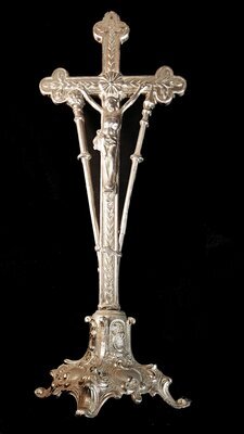 Kreuz vom Dreinageltyp mit eher flach nach oben ausgestreckten Armen. Die Füße stehen übereinander auf dem Suppedaneum (einer) Konsole. Als ein Stück gegossen. Angedeuteter strahlenförmiger Nimbus über dem Kopf Christi. Kein Titulus. Die Balken und die drei Passen sind mit spitzen Blättern verziert. Schräg neben dem Korpus sind 2 Lanzen dargestellt: An ihren Spitzen ist bei der Linken ein Schwamm, bei der Rechten die Lanzenspitze. Der auffällige und für das Kreuz recht große dreieckige Sockel ist im Stil des Neo-Rokoko gestaltet.