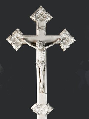 Kreuz vom Dreinageltyp mit eher flach nach oben ausgestreckten Armen. Die Füße stehen übereinander auf dem Suppedaneum (einer Konsole). Kein Nimbus. Der Titulus ist im Längsbalken integriert. Vier quadratische Passen mit Schmuckverzierungen. Der viereckige Sockel mit nach aussen stehenden Füßchen ist mit Ornamenten im Stil der Renaissance geschmückt.