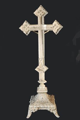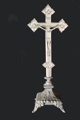 Kreuz vom Dreinageltyp mit eher flach nach oben ausgestreckten Armen. Die Füße stehen übereinander auf dem Suppedaneum (einer Konsole). Kein Nimbus. Der Titulus ist im Längsbalken integriert. Vier quadratische Passen mit Schmuckverzierungen. Der viereckige Sockel mit nach aussen stehenden Füßchen ist mit Ornamenten im Stil der Renaissance geschmückt.