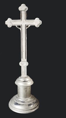 Sterbekreuz (Standkreuz) aus dem 19. Jahrhunderts. Das Kreuz - meist in Form eines Lazaruskreuzes mit Passen (Kleeblättern) an den Enden der Balken - ist ein religiöser Gegenstand der katholischen Kirche. Es wurde dem Sterbenden gezeigt oder gereicht. Durch den Verweis auf Lazarus soll dem Sterbenden die Verheißung auf die Auferstehung verdeutlicht werden. Das Standkreuz ist aus Metall gefertigt. In Längs- und Querbalken wurde schwarz lackiertes Holz eingelegt. Die Enden des Kreuzes sind typisch neugotisch mit 3 Passen versehen. Am unteren Ende des Längsbalkens ist dieser angedeutet. Der Korpus und der Ständer sind aus Neusilber gefertigt. Die Arme sind im etwa 30° Winkel schräg nach oben ausgestreckt. Die Füße stehen übereinander auf einer Konsole. Über dem Korpus hängt der Titulus crucis (die INRI-Tafel) in der Form eines geschwungenen Bands. Hinter dem Kopf des Korpus befindet sich ein strahlenförmiger Nimbus (Heiligenschein). Der runde gerippte Ständer ist im oberen Teil säulenförmig.
