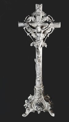 Ein Kreuz aus Metall umrankt von Weinreben. Die Balken immitieren Holz. Die Reben umranken Längs- und Querbalken und sind auch an der Spitze noch angedeutet. Dreinageltyp, Nimbus hinter/über dem Kopf Christi, darüber der Titulus in Form einer Schriftrolle in der Form eines Römischen Feldzeichens. Der auffällige und für das Kreuz eigentlich zu große dreieckige Sockel ist im Stil des Neo-Rokoko gestaltet.