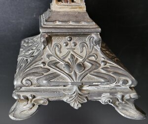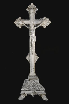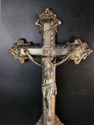 Erheblich durch mit Schwerpunkt Renaissance-Dekor verziertes Kruzifix mit viereckigem Sockel. Kreuz vom Dreinageltyp mit eher flach nach oben ausgestreckten Armen. Die Füße stehen übereinander auf dem Suppedaneum (einer) Konsole. Über dem Kopf an der Kreuz und der Balken strahlenförmiger Nimbus. Kein Titulus.