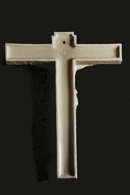 Kreuz vom Viernageltyp mit nahezu waagrecht ausgestreckten Armen. Die Füße stehen nebeneinander auf dem Suppedaneum (einer) Konsole. Der ebenfalls aus Ton modellierte Titulus (INRI-Tafel) befindet sich oben am Längsbalken.