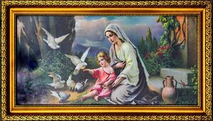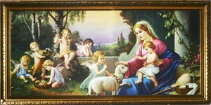 Das um 1926 von Josef August Untersberger entworfene Schlafzimmerbild ist in einem vergoldetem achteckigem Stuckrahmen hinter Glas erhalten. Das Jesuskind steht auf dem Schoß Mariens und wird von ihr mit beiden Händen gehalten. Rechts von beiden steht Josef mit Typische Schlafzimmerbilder im Handtuchformat hingen in der ersten Hälfte des 20. Jh. nicht nur über bäuerlichen Ehebetten. Das extreme Querformat ergab sich aufgrund der geringen Deckenhöhe der Schlafzimmer. Das Schlafzimmerbild mit der Darstellung der Heiligen Familie ist ist eines der verbreitetsten seiner Art und wurde in hoher Auflage gedruckt. Schlafzimmerbilder wurden in den 1920er Jahren bis in die 1960er Jahre überaus populär. Sie galten in "gehobenen Kreisen" jedoch bald als Unkunst. Der Kunsthandel bezeichnete sie schon 1928 als „Schmarren“ und „süßlicher Kitsch“. Der Münchner Dichter und Sammler von Grafik Eugen Roth nannte Schlafzimmerbilder wegen ihrer Farben und Gestaltung „überlegten Giftmord“, eine „gewinnsüchtige Täuschung des gutmeinenden, aber leider ahnungslosen Käufers“. Heute werden die übertrieben kitschigen Bilder augenzwinkernd-ironisch wieder geschätzt und genießen gewissermaßen Kultstatus. (Quelle des Absatzes: Wikipedia-Artikel Schlafzimmerbild )