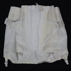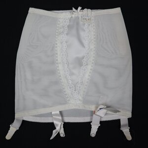Weißer Hüftgurt der Marke Looki mit Spitzendekor. Die Seitenteile sind aus elastischem Netzstoff mit Blumenmuster gearbeitet, sodass sich der Hüftgurt der Figur anpasst. Unten sind an vier Elastikbändern Haken angebracht, an denen Strümpfe fixiert werden können. Es handelt sich laut Etikett um das Modell 4L56.