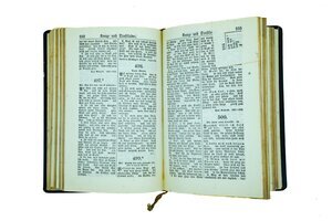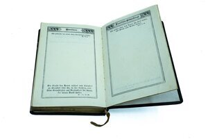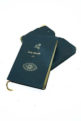 Dies ist das Gesangbuch von Elise Schmidt mit Schutzhülle und golden verziertem Buchdeckel. Erst bei der Entfernung der schlichten Schutzhülle aus schwarzer Pappe wird erkennbar, dass der schwarze Vorderdeckel des Buches mit dem golden aufgeprägten Namen der Besitzerin, der Jahreszahl des Erhalts und dem Spruch "Gott ist die Liebe" versehen ist. Auch eine einzelne stilisierte Rose über dem Namen und ein Rankenmuster in Form eines Auges um den Spruch sind in Goldprägung aufgebracht. Die Buchseiten sind von außen mit einem Goldschnitt versehen. Auf dem Einband ist in goldener Prägung das Wort "Gesangbuch" aufgeführt. Das Buch verfügt über ein Leseband und ein loses Lesezeichen in Form eines bedruckten semitransparenten Kreuzes mit Aufschrift. Einem handschriftlichen Eintrag auf der Titelseite ist zu entnehmen, dass dieses Buch ein Geschenk an Elise Schmidt war, welches ihr in Gedenken an ihre Großmutter übergeben wurde. Das Buch umfasst unter anderem Lieder für besondere Stände, Zeiten und Verhältnisse, geistliche Volkslieder, Gebete für verschiedene Anlässe, den kleinen Katechismus und eine Familienchronik, in welche wichtige Daten wie Geburts- und Todestage eingetragen werden konnten.