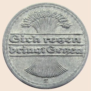 Das Avers zeigt zentral das Nominal "50 PFENNIG", umgeben vom Landesnamen "DEUTSCHES REICH" und der Jahreszahl. Auf dem Revers befindet sich ein Bündel Weizenähren, überlagert vom Schriftzug "Sich regen bringt Segen". Darunter wird das Kürzel der Prägestätte dargestellt. Der Rand ist geriffelt.