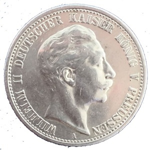 Prägezeitraum: 1891-1912 Das Avers zeigt das Kopfbild von Kaiser Wilhelm II. mit Blickrichtung nach rechts über dem Kürzel der Prägestätte A=Berlin. Die Umschrift lautet "WILHELM II DEUTSCHER KAISER KÖNIG V. PREUSSEN". Auf dem Revers befindet sich der große gekrönte Reichsadler mit preußischem Wappenadler auf der Brust. Die Umschrift enthält den Landesnamen "DEUTSCHES REICH", die Jahreszahl und das Nominal "ZWEI MARK" zwischen zwei Sternen. Der Rand ist geriffelt.
