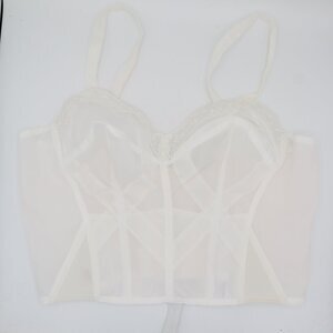 Dieser Büstenhalter der Marke Susa ist aus weißer Spitze gefertigt, es handelt sich laut Schild um das Modell 8003. Der obere Teil der Cups ist mit plissiertem Netzstoff bezogen, sodass sich eine geriffelte Struktur ergibt. Hinten schließt der Büstenhalter mit einem großen Hakenverschluss.