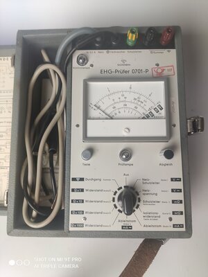 Dieses Messgerät wird benötigt zur Schutzmaßnahmen-Prüfung nach VDE0701. Hiermit müssen in Gewerbebetrieben ortsveränderliche elektrische Betriebsmittel ( zum Beispiel Bohrmaschinen, Staubsauger, elektrische Messgeräte und so weiter ) in regelmäßigen Abständen geprüft werden. Folgende Untersuchungen können durchgeführt werden: Netz-Schutzleiterprüfung; Netzspannungsmessung; Isolationswiderstandsmessung (Verbraucher); Arbeitsstrommessungen. Das Messgerät ist in einem stoßsicheren Holzkasten untergebracht.