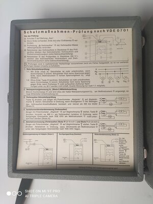 Dieses Messgerät wird benötigt zur Schutzmaßnahmen-Prüfung nach VDE0701. Hiermit müssen in Gewerbebetrieben ortsveränderliche elektrische Betriebsmittel ( zum Beispiel Bohrmaschinen, Staubsauger, elektrische Messgeräte und so weiter ) in regelmäßigen Abständen geprüft werden. Folgende Untersuchungen können durchgeführt werden: Netz-Schutzleiterprüfung; Netzspannungsmessung; Isolationswiderstandsmessung (Verbraucher); Arbeitsstrommessungen. Das Messgerät ist in einem stoßsicheren Holzkasten untergebracht.