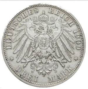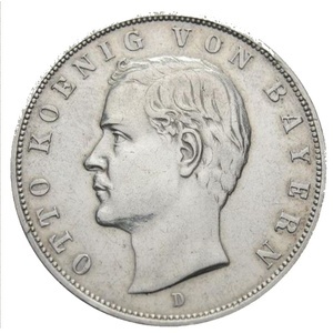 Prägezeitraum: 1908-1913 Das Avers zeigt das Kopfbild von König Otto mit Blickrichtung nach links über dem Kürzel der Prägestätte D=München. Die Umschrift lautet "OTTO KOENIG VON BAYERN". Auf dem Revers befindet sich der große gekrönte Reichsadler mit preußischem Wappenadler auf der Brust. Die Umschrift enthält den Landesnamen "DEUTSCHES REICH", die Jahreszahl und das Nominal "DREI MARK" zwischen zwei Sternen. Der Rand ist glatt und trägt die Inschrift "GOTT MIT UNS". Die Worte werden durch jeweils ein Eisernes Kreuz zwischen Arabesken getrennt.