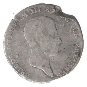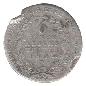 Auf dem Avers steht umlaufend "VIER UND ACHZIG EINE FEINE MARK" In einen Eichenlaubkranz eingebettet steht "6 EINE REICHS THALER 1814 B". Auf dem Revers steht umlaufend "FRIEDRICH WILHELM III: KÖNIG VON PREUSSEN" und im Zentrum ist das Konterfei des Königs mit Blickrichtung rechts wiedergegeben. Die Münze ist durch Beschädigungen, vermitlich durch Feldbearbeitungsgeräte, im Randberich stank beschägigt.