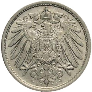 Auf dem Avers trägt die Münze zentral die Zahl "10" des Nominals, welche kreisförmig von der Nominaleinheit "PFENNIG", sowie einer Jahreszahl und dem Landesnamen "DEUTSCHES REICH" umgeben ist. Das Wort "PFENNIG" ist von zwei Punkten eingefasst. Zentrales Motiv des Revers ist der große gekrönte Reichsadler mit preußischem Wappenadler auf der Brust. Rechts und links neben dem Schwanz des Adlers befindet sich das Kürzel der Prägestätte. Der Rand ist glatt. 10 Münzen der Prägejahre/Münzanstalt sind im Bestand: 1888/F, 1899/A, 1901/A, 1905/A, 2x 1908/A, 1911/A, 1912/J, 1914/A, und 1916/A.