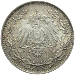 Der Avers zeigt das Nominal "1/2 MARK" im Eichenkranz. Der Eichenkranz wird vom Landesnamen "DEUTSCHES REICH" und der Jahreszahl eingefasst. Auf dem Revers befindet sich der große, gekrönte Reichsadler mit preußischem Wappenadler auf der Brust im Eichenkranz. Darunter befindet sich das Kürzel der Prägestätte. Der Rand ist geriffelt. Besonderheit: großer Adler