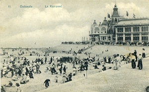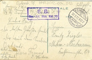 Postkarte vom 20. Februar 1915 aus Ostende an Fritz Ziegler in Mannheim-Neckarau. Auf der Vorderseite: Schwarz-weiß Fotografie mit der Aufschrift: "Ostende - Le Kursaal". Auf der Rückseite: 2 Feldpoststempel, handschriftliches Grußwort.