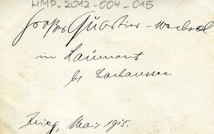 Schwarz-weiß Fotografie eines Pferdefuhrwerks mit Soldaten, Beschriftung auf der Rückseite: "Großer Quartier-Wechsel in Xaumant (?) b. Lachaussee / Krieg, Mai, 1915".