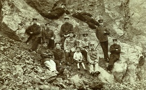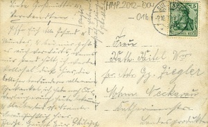 Postkarte aus Sulzburg an Frau Keitel / Georg Ziegler in Mannheim-Neckarau. Auf der Vorderseite: Schwarz-weiß Fotografie von 12 Soldaten und einem Jungen in einem Steinbruch. Auf der Rückseite: Briefmarke, Postestempel vom 2. Oktober 19??, handschriftliches Grußwort.