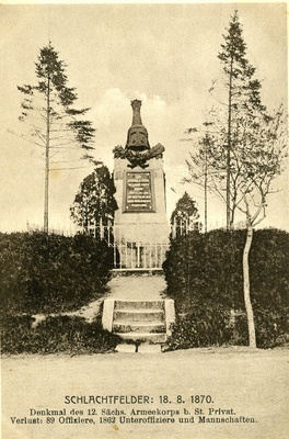 Postkarte vom 27. September 1915 aus dem Feldlazarett 2 der bayerischen Ersatz Division an Friedrich Ziegler in Mannheim-Neckarau. Auf der Vorderseite: Schwarz-weiß Aufnahme mit der Aufschrift "Schlachtfelder: 18.8.1870. Denkmal des 12. Sächs. Armeekorps b. St. Privat. Verlust: 89 Offiziere, 1862 Unteroffiziere und Mannschaften.". Auf der Rückseite: 2 Poststempel, handschriftliches Grußwort.