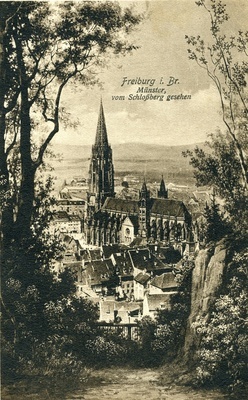 Feldpostkarte vom 29. Oktober 1915 vermutlich aus Freiburg i. Br. An Georg Ziegler in Mannheim-Neckarau. Auf der Vorderseite: Schwarz-weiß Aufnahme mit der Aufschrift: "Freiburg i. Br. Münster, vom Schloßberg gesehen". Auf der Rückseite: handschriftliches Grußwort.