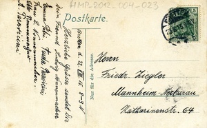 Postkarte vom 22. August 1915 aus Bretten an Friedrich Ziegler in Mannheim-Neckarau. Auf der Vorderseite: Kolorierte Abbildung des Hotels Krone und des Melanchthonhauses in Bretten. Auf der Rückseite: Briefmarke, Poststempel vom 23. August 1915, handschriftliches Grußwort.