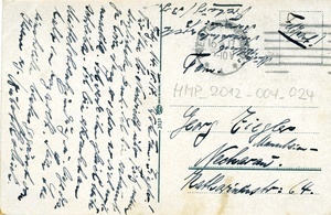 Postkarte vom 14. April 1917 aus Freiburg i. Br. An Georg Ziegler in Mannheim-Neckarau; Vorderseite: Kolorierte Aufnahme mit der Aufschrift °Freiburg i. B. Gotischer Brunnen in der Kaiserstrasse.°; Rückseite: Poststempel vom 16. April 1917, handschriftliches Grußwort.