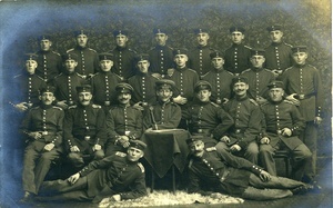 Feldpostkarte vom 28. September 1916 aus dem I. Rekruten Depot in Müllheim an Friedrich Ziegler in Mannheim-Neckarau. Auf der Vorderseite: Schwarz-weiß Gruppenaufnahme von Soldaten. Auf der Rückseite: Poststempel vom 29. September 1916, Stempel des Rekruten-Depots, handschriftliches Grußwort.