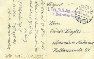 Feldpostkarte vom 28. September 1916 aus dem I. Rekruten Depot in Müllheim an Friedrich Ziegler in Mannheim-Neckarau. Auf der Vorderseite: Schwarz-weiß Gruppenaufnahme von Soldaten. Auf der Rückseite: Poststempel vom 29. September 1916, Stempel des Rekruten-Depots, handschriftliches Grußwort.