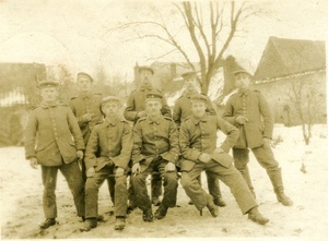Feldpostkarte vom 26. Oktober 1916 aus Frankreich an Georg Ziegler in Mannheim-Neckarau. Auf der Vorderseite: Schwarz-weiß Fotografie von Soldaten im Schnee. Auf der Rückseite: Poststempel vom 28. Oktober 1916, handschriftliches Grußwort.
