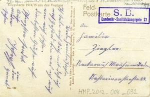 Feldpostkarte von 1914/15 aus Markirch im Elsass (Sainte-Marie-aux-Mines, der in den Vogesen liegende Ort gehörte damals zum Reichsland Elsaß-Lothringen) an Familie Ziegler in Mannheim-Neckarau. Auf der Vorderseite der Karte ist eine Schwarz-Weiß-Fotografie abgebildet, die eine Gruppe von Soldaten vor einem Zugwagon zeigen, der "Liebesgaben" geliefert hat. Grüßend und die "edlen Spender" ehrend haben die Soldaten ihre Feldmützen gezogen. Auf der Rückseite befinden sich ein handschriftliches Grußwort und der Stempel der Landwehr-Sanitätskompagnie 27. So genannte Liebesgaben bezeichneten im Deutschen Kaiserreich Hilfsgüter-Sendungen von der Bevölkerung an Frontsoldaten oder auch an Verwundete in Lazaretten oder an Kriegsgefangene. Meist enthielten diese Sendungen Kleidung, Nahrung und Genussmittel. Häufig wurden die Versandaktionen durch gemeinnützige Organisationen wie dem Roten Kreuz oder Frauenvereinen durchgeführt. Diese Unterstützung durch die "Heimatfront" diente nicht nur der materiellen Versorgung der Soldaten, sondern trug auch zur Verbesserung ihrer Stimmung und Moral bei. [Johanna Kätzel]