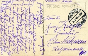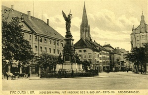 Feldpostkarte vom 14. Februar 1916 an Georg Ziegler in Mannheim-Neckarau. Auf der Vorderseite: Schwarz-weiß Aufnahme vom "Siegesdenkmal mit Kaserne des 5. Bad. Inf.-Rgts. 113. Kaiserstrasse" in Freiburg im Breisgau. Auf der Rückseite: Poststempel vom 14. Februar 1916, handschriftliches Grußwort.