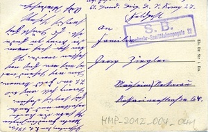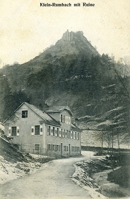 Feldpostkarte vom 5. Januar 1916 an Georg Ziegler in Mannheim-Neckarau. Auf der Vorderseite: Schwarz-weiß Aufnahme von "Klein-Rumbach mit Ruine" im Winter. Auf der Rückseite: Stempel der Landwehr-Sanitätskompanie 27, handschriftliches Grußwort.