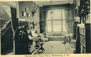 Postkarte vom 24. Juni 1918 an Georg Ziegler in Mannheim-Neckarau. Auf der Vorderseite: Schwarz-weiß Abbildung eines Wohnzimmers mit Klavier, Aufschrift: "Töchterheim Haus Flora, Godesberg a. Rh.". Auf der Rückseite: Briefmarke, Poststempel aus Godesberg, handschriftliches Grußwort.