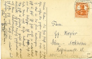 Postkarte vom 24. Juni 1918 an Georg Ziegler in Mannheim-Neckarau. Auf der Vorderseite: Schwarz-weiß Abbildung eines Wohnzimmers mit Klavier, Aufschrift: "Töchterheim Haus Flora, Godesberg a. Rh.". Auf der Rückseite: Briefmarke, Poststempel aus Godesberg, handschriftliches Grußwort.