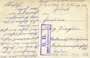 Postkarte vom 23. Dezember 1915 an Georg Ziegler in Mannheim-Neckarau. Auf der Vorderseite: Schwarz-weiß Aufnahme eines Soldatenfriedhofs am Donon, handschriftlich: "Auf Wiedersehen!!!". Auf der Rückseite: Stempel der Landwehr-Sanitätskompanie 27, handschriftlicher Grußtext.