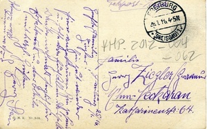 Feldpostkarte vom 26. Januar 1916 an Georg Ziegler in Mannheim-Neckarau. Auf der Vorderseite: Schwarz-weiß Aufnahme des Münsters in Freiburg im Breisgau. Auf der Rückseite: Poststempel aus Freiburg, handschriftliches Grußwort.