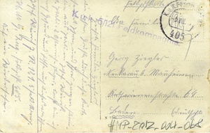 Feldpostkarte an Georg Ziegler in Mannheim-Neckarau. auf der Vorderseite: Schwarz-weiß Aufnahme von zwei Flugzeugen (ein deutsches, ein französisches) über einer Stadt. Die Beschriftung ist: "Ein Fliegerkampf". Die Flugzeuge sind handschriftlich mit "1." und "2." nummeriert. Auf der Rückseite: 2 Feldpoststempel, handschriftliches Grußwort.