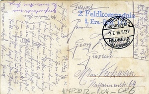 Feldpostkarte vom 2. Juli 1916 an Familie Ziegler in Mannheim-Neckarau. Auf der Vorderseite: Kolorierte Abbildung des Schlosses Wildenstein mit Donau im Vordergrund, auf der ein Padler zu sehen ist. Auf der Rückseite: Stempel der 2. Feldkompagnie - 1. Ersatz Bataillon, Stempel des Truppenübungsplatzes Heuberg Konstanz, handschriftliches Grußwort.