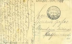 Feldpostkarte vom 22. Februar 1915 an Friedrich Ziegler in Mannheim-Neckarau. Auf der Vorderseite: Schwarz-weiß Aufnahme von "Longuyon, eine französische Stadt, um die auf beiden Seiten stark gekämpft wurde". Auf der Rückseite: Stempel eines Feldlazarettes, Feldpoststempel der bayerischen Infanterie-Division, handschriftliches Grußwort.