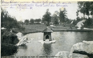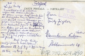 Feldpostkarte vom 4. August 1915 (?) an Fritz Ziegler in Mannheim-Neckarau. Auf der Vorderseite: Schwarz-weiß Aufnahme eines Parks in Valenciennes mit der Aufschrift: "Valenciennes. L’étang du Parc du Jardin de la Rhonelle". Auf der Rückseite: Stempel, handschriftliches Grußwort.