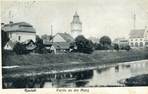 Feldpostkarte vom 17. März 1916 an Familie Ziegler in Mannheim-Neckarau. Auf der Vorderseite: Schwarz-weiß Aufnahme von Rastatt vom Fluss Murg aus gesehen. Auf der Rückseite: Poststempel aus Rastatt, handschriftliches Grußwort.